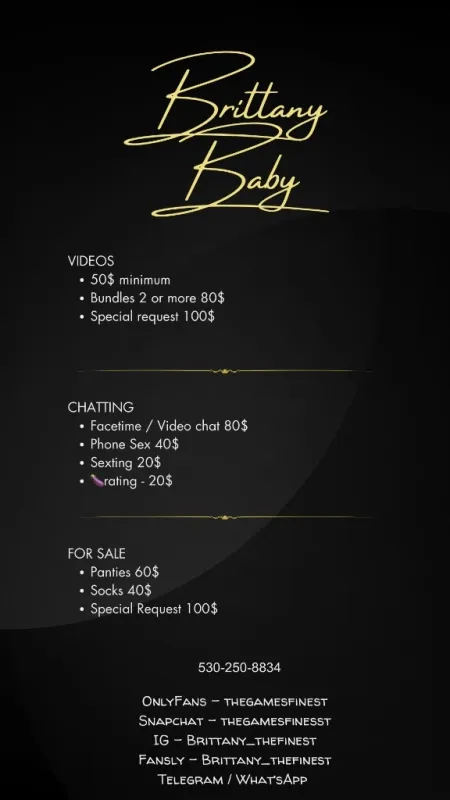 MY NAME IS "BRITTANY BABY" ð ð²FACETIME/GOOGLE DUO REQUIRED ð² IM VERY FUN , EASY GOING & A EXPERIENCE YOU WILL NOT FORGET... I PROMISE ð€ðœ..( I ONLY DEAL WITH CLEAN & MATURE MEN ) â(BALD ðº KITTY) â(GREAT HYGIENE) â(SAFE & CLEAN AREA) ððŒSERIOUS CALLERS ONLY PLEASE ððŒ ðŠFACETIME SHOWS AVAILABLEðŠ âNO BARE SERVICES â NO GFEâ NO LAW ENFORCEMENT OF ðŠ @thegamesfinest IG ðž brittany_thefinest X ð¥ thegamesfinesst snap ð» thegamesfinesst fansly â